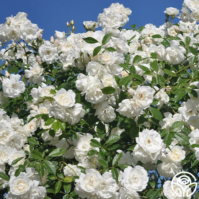 This rose is the continual blooming sport of the outstanding Floribunda, Iceberg. In the spring she is covered with clouds of pure white, 3“, semi-double blooms of 20-25 petals which exudes a gentle, sweet, honey fragrance. Expect her to reach heights of 8-15’ with ease.