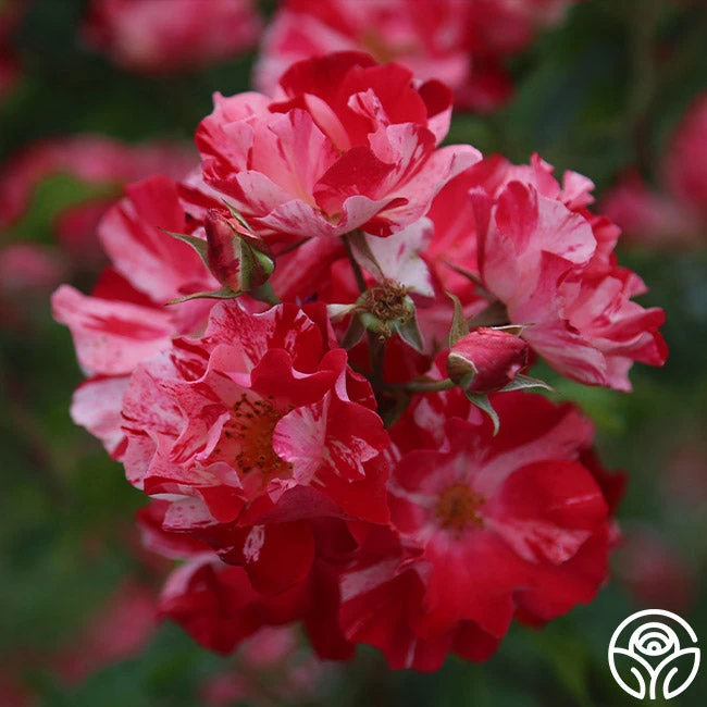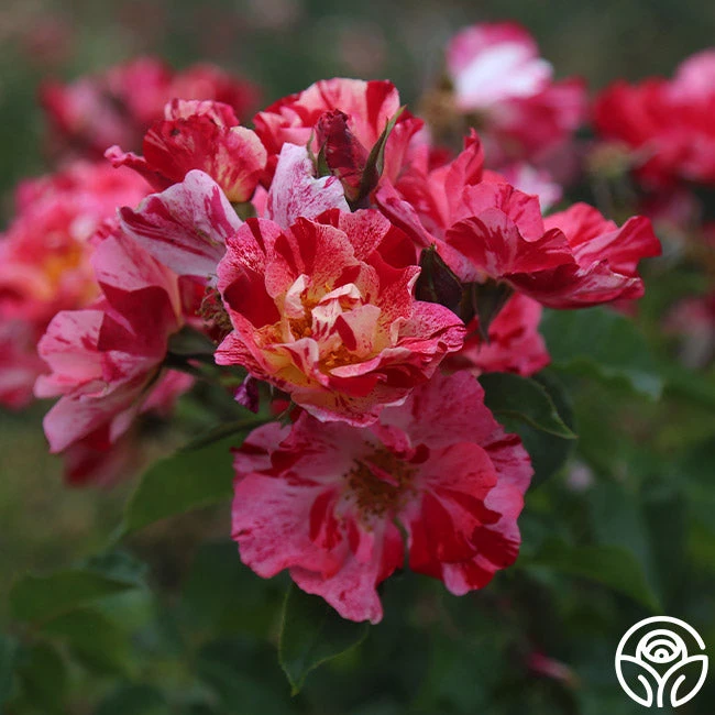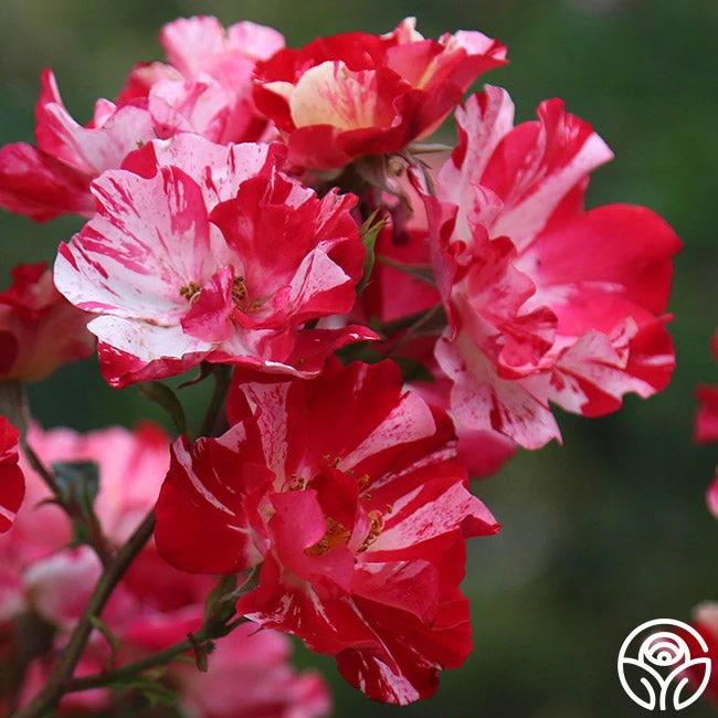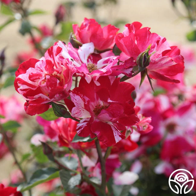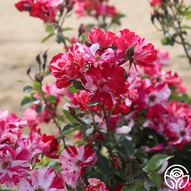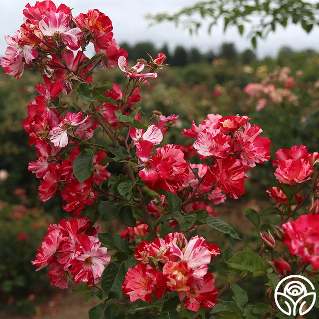 This patriotic rose is a stunner with her striped velvet-red and white, 4” blooms. We love the long-lasting blooms produced in large sprays and her spicy/sweet apple fragrance. Fourth of July is a vigorously growing, disease-resistant, continually blooming plant with deep-green foliage. Fourth of July is a Climber that will reach heights of 8-10’, but she may also be grown as a Shrub rose in cooler climates.