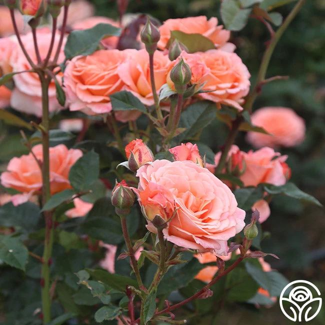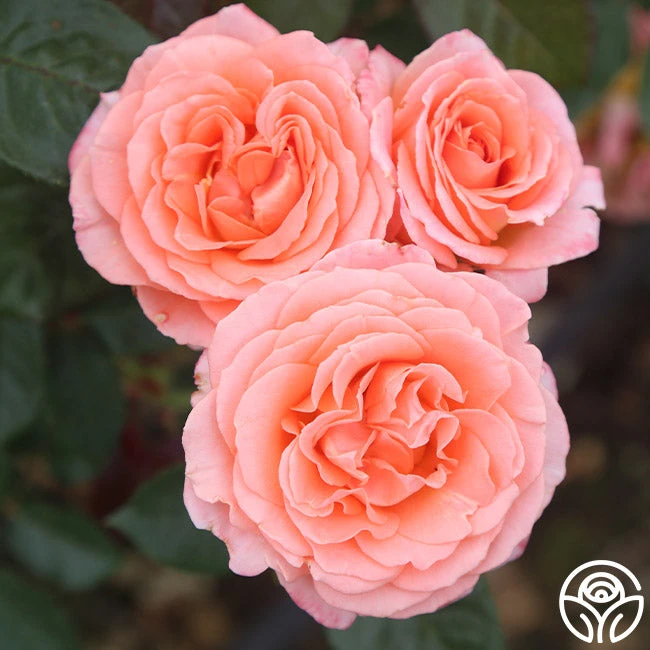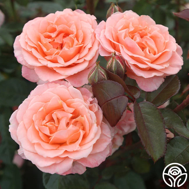 Jump for Joy™ is a Floribunda rose with large 3-4″, ruffled blooms that are borne in clusters on a round, bushy shrub. The delicious, peachy-pink color pairs well with its light apple fragrance. Expect her dark red new growth to pop against glossy, green foliage. We recommend planting Jump for Joy alone or with her sister seedling, Sparkle & Shine for a burst of color in your garden.