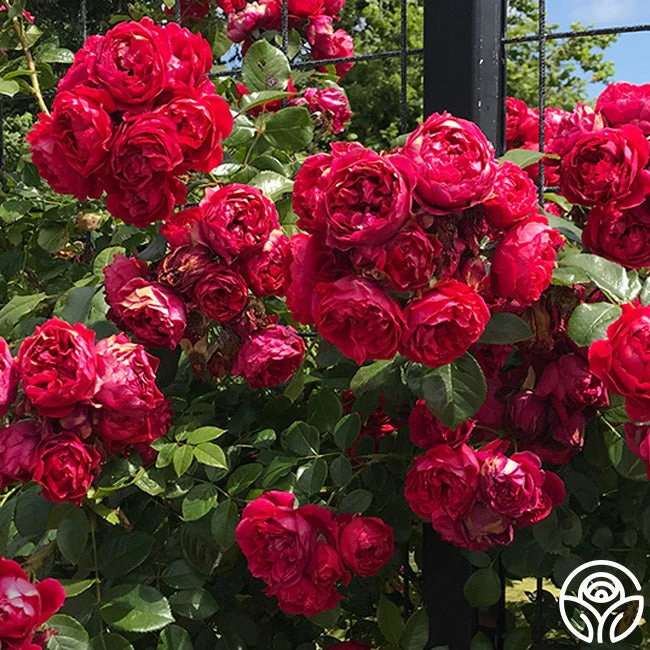 Florentina is a very robust, disease-resistant, and Winter-Hardy Climber with nostalgic red flowers that bloom throughout the season. Her 3.5” blossoms are moderately fragrant, and she stays more compact as a Climber topping out around 7’ in height. This very floriferous variety grows elegantly along a fence, trellis, or arbor for support.